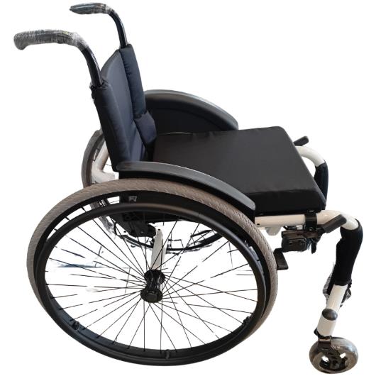 A Cadeira MB1 proporciona conforto para uso ativo com almofada 5cm e encosto de alta densidade, apoio de pés ajustável (altura e ângulo) e faixa panturrilha. Possui protetor de roupa para higiene e punhos emborrachados, além de uma estrutura monobloco de alumínio com encosto rebatível para otimzar transporte e manobrabilidade.