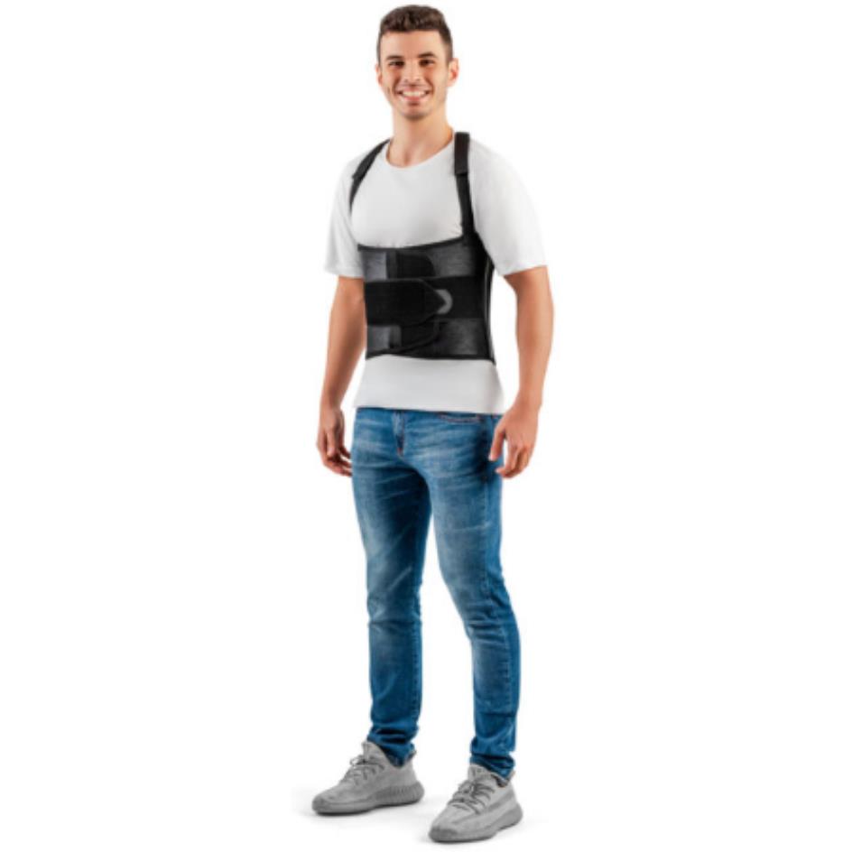 Solte os fechos aderentes das faixas elásticas, das tiras do ombro e das abas em neoprene. Vista o produto. Insira as mãos nos bolsos de ajuste, de forma que facilite o fechamento, transpassando as mãos sobre o abdômen. Ajuste as duas faixas elásticas externas. Corrija a postura, posicionando os ombros para trás. Ajuste as tiras dos ombros e fixe-as nos fechos aderentes.