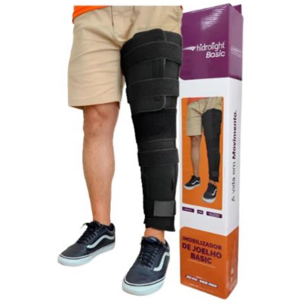 Imobilizador de Joelho Basic atua por meio de sua estrutura composta por tecido em dupla frontura de poliéster, tiras de fecho aderente em nylon e talas anatômicas (moldáveis) em alumínio, que promovem a restrição controlada dos movimentos de flexão, extensão e lateralização do joelho.
